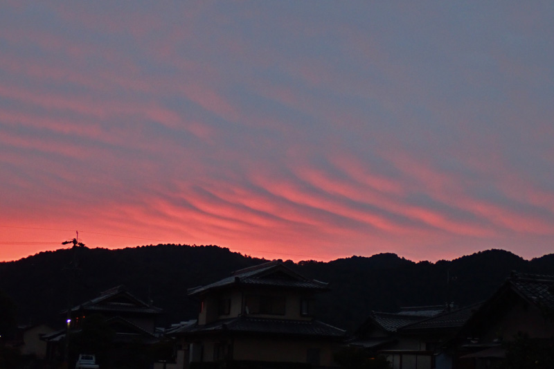 東の空は朝焼けで、高層雲の下層の波状雲がきれいに見えました。