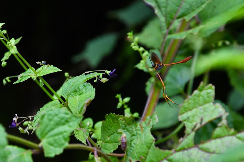 黒花ヒキオコシに来たスズキハラボソツリアブ。