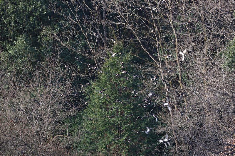 何らかの合図で池の縁に生えている木に集まったオシドリ。