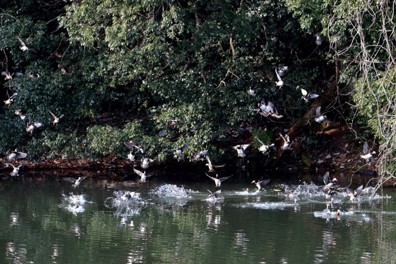 ようにばらばらに池の岸辺に移動していきます。このような飛翔は日によって異なりますが