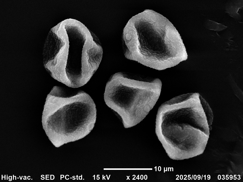 花粉は球形、等極性、発芽口は3孔型で、赤道面にある。