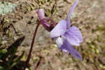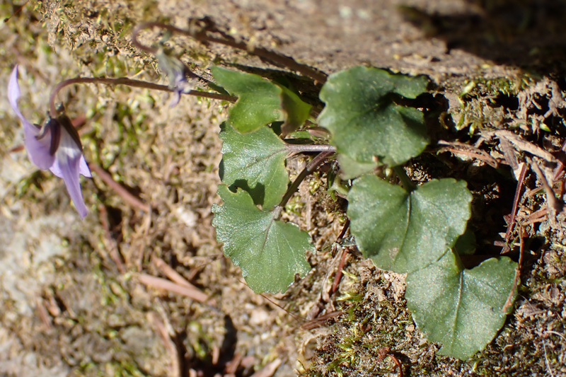 葉は丸いさじ型、花の距は長い。側弁に毛はないことからコスミレとしました。