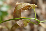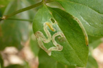 センニンソウの葉に描かれた食痕。黄色い幼虫がいました。