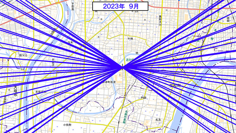 2023年の9月における岐阜市立柳津小学校での満月の出る方向の日変化を示しました。